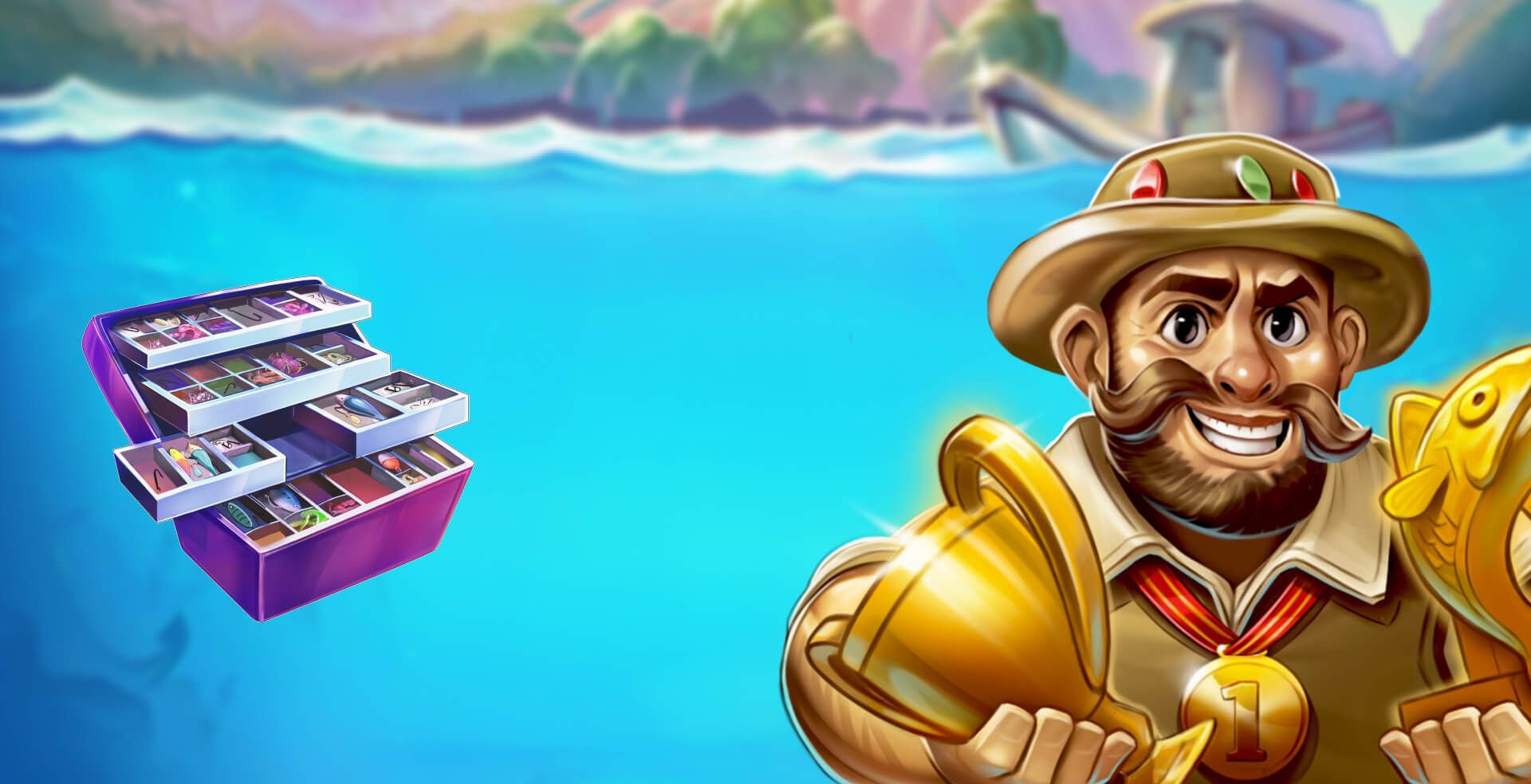 Catch- On any random spin, the Fisherman can cast his hook into the waters on any of the 4 available rows. At the end of the spin, any Fish on the matched row will be collected with the value of each Fish being awarded as an instant cash prize. On some activations, the hook can contain an extra win multiplier that is applied to all Fish values before being awarded. On a spin with no Fish symbols, the Fisherman has the chance to remain on the reels and nudge to a different row for a second chance to catch Fish symbols.
