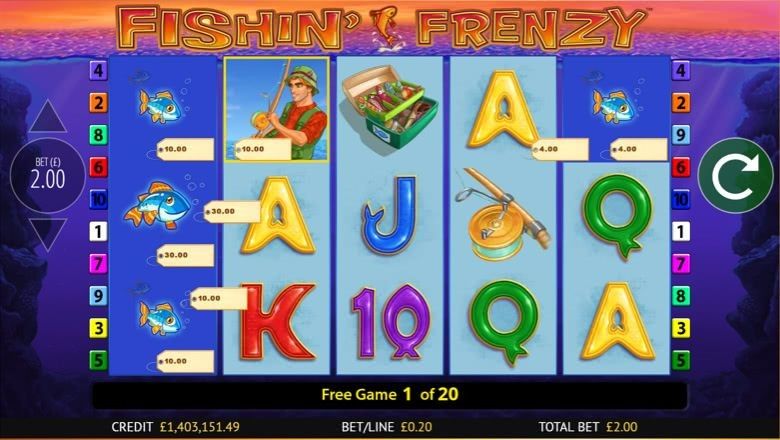 Free Spins- Landing 3 or more Scatters on the reels activates free spins with up to 20 being awarded for landing 5. During the free spins mode, the Fisherman Wild symbol activates its additional feature.