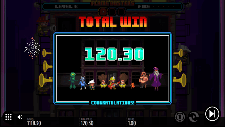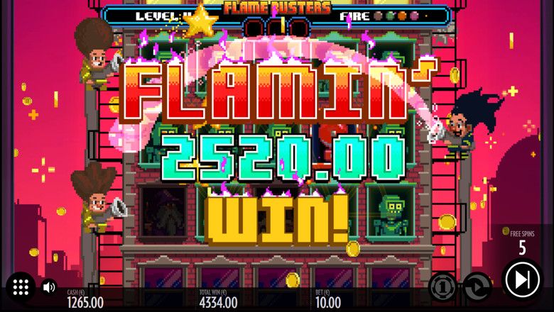 It's not all work here in Flamebusters, as landing 3 or more Scatters on the reels will activate the free spins bonus game. During the bonus game, landing additional Scatters will increase the building level by level up to an additional 5 floors of firefighting action. The flames will also engulf lower payline symbol for scorching hot rewards.