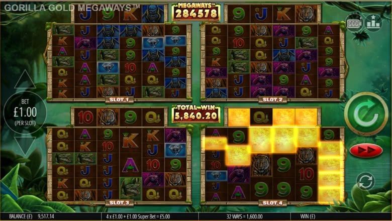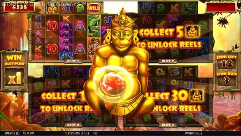 Can you get 4 or more scatter symbols in view on any window? If you manage it, you’ll be awarded the Gorilla Gold Bonus, for more extra spins that you can shake a stick at! You can win up to 35 free spins or 30 super spins, and the unlimited win multiplier will be active on these extra spins too, for an additional treat. If you go for the super spins, you’ll try to collect Golden Gorillas. Get 5 to be awarded an additional window and 5 more spins, while 30 will get you 3 more windows and another 5 spins!