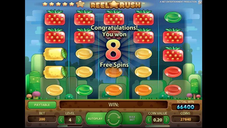 Fill the reels with fruity fun and get more than a sugar rush in the Reel Rush slot by NetEnt. Match up tasty fruit symbols and expand the reels on every win to unlock up to 1,875 delicious ways to win. Match up even more symbols to unlock up to 8 free spins and increase the number of ways to win to a whopping 3,125. Also be on the lookout for special golden Wild stars that substitute for any paytable symbol.